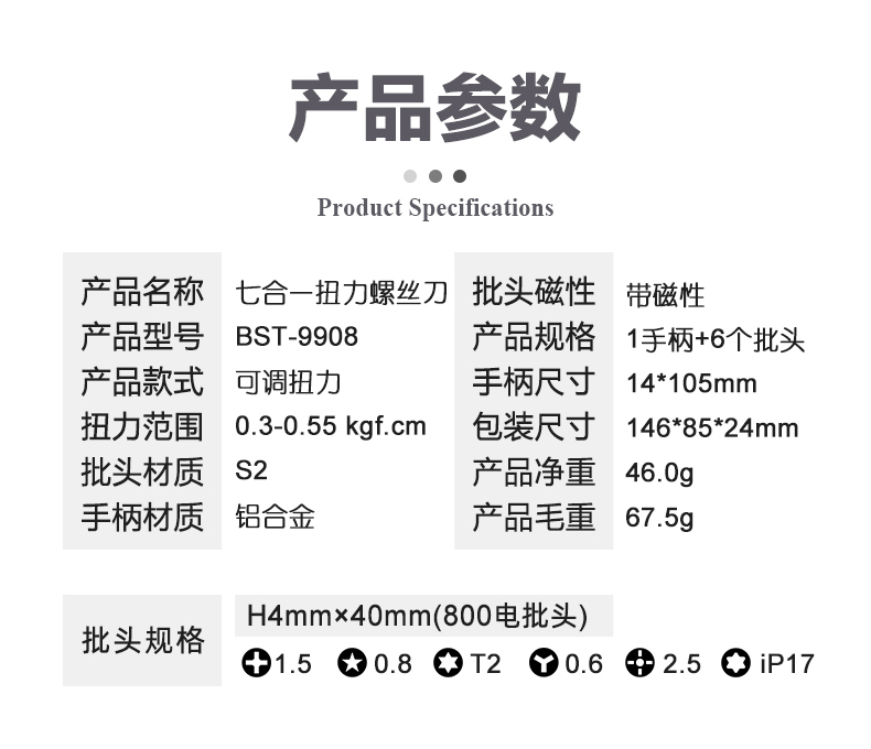 ▶ 产品名称: 七合一可调扭力螺丝刀套装▶ 产品型号: BST-9908▶ 产品类别: 套批系列