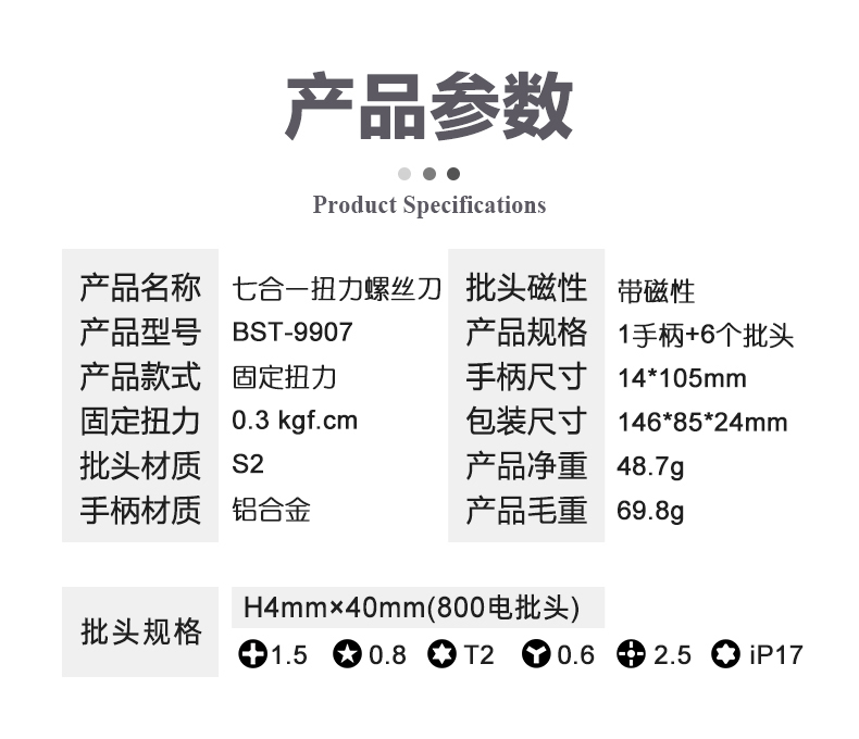 ▶ 产品名称: 七合一扭力螺丝刀套装▶ 产品型号: BST-9907▶ 产品类别: 套批系列