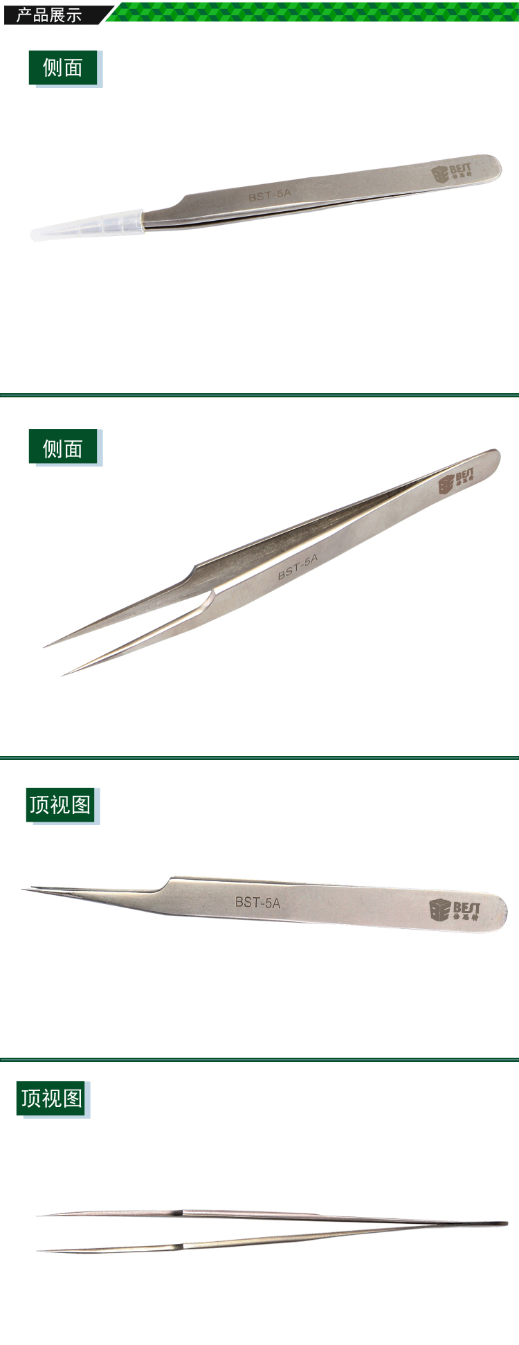 ▶ 产品名称: 亚光镊子 不锈钢镊子▶ 产品型号: BST-5A▶ 产品类别: 镊子系列
